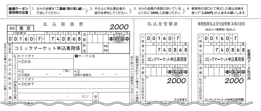コミックマーケット98のサークル参加費を繰越したサークルで、旧C99に申込を行わず、新たに新C99にサークル申込を行う場合は、お手元のクーポンを利用し、残りのサークル参加費2000円を負担して下さい。郵送申込の場合は、下図のように金額の訂正・押印をした上で郵便振替の手続きを行い、お手元の繰越クーポンを配置用データの所定欄にのり付けして下さい。オンライン申込の場合は、画面の指示に従って手続きをお願いします。郵送申込の繰越クーポンは郵送申込のみに、オンライン申込の繰越クーポンはオンライン申込のみに使用可能です。使用にあたっては、送付されたクーポン付属の説明をご参照下さい。
